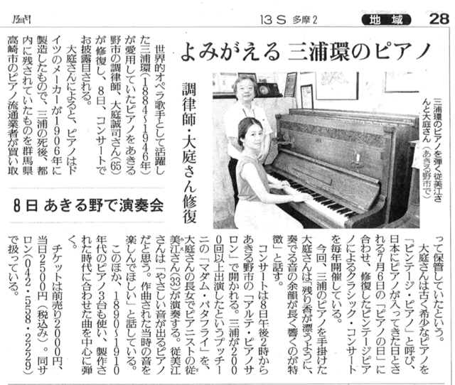 よみがえる三浦環のピアノ(読売新聞2018年07月03日)