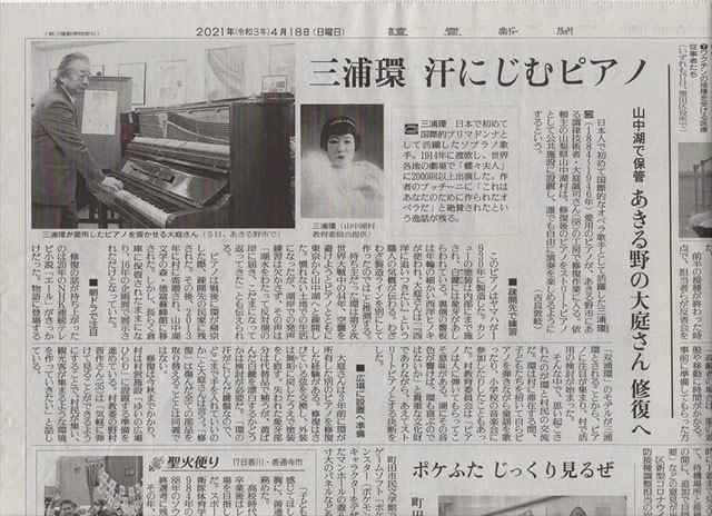 三浦環 汗にじむピアノ(読売新聞2021年4月18日)