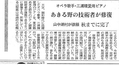 >オペラ歌手・三浦環愛用ピアノ あきる野の技術者が修復 (日経新聞2021年6月3日)